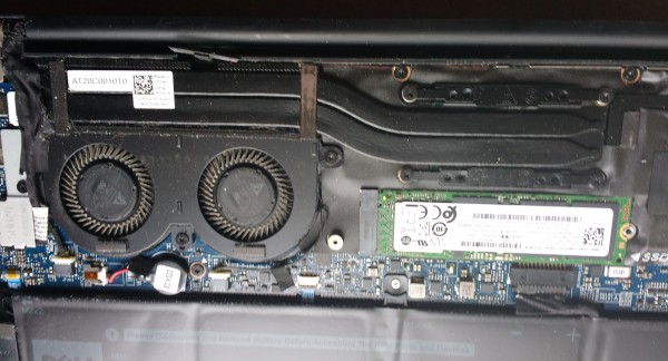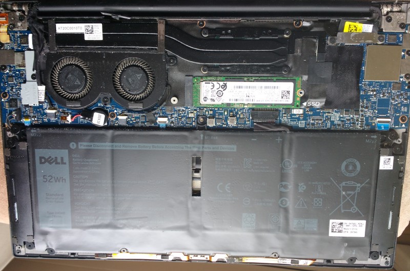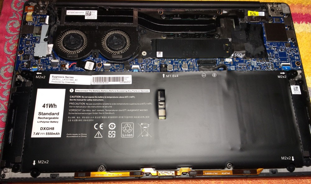 When the lid is off, you see a huge battery and twin fans, taking care of a double heatpipe. And in between sits the NVMe disk. The disk is covered with a metal heatsink. It is a Samsung PM981 NVMe disk of 256 GB. It's a fast disk, so I'm not going to replace it. The battery, however, is dead as a dodo on life support. When 'fully charged' it lasts for 5 to 10 minutes. So that one has to go. The battery is of type 'DXGH8'. A new one arrived today.