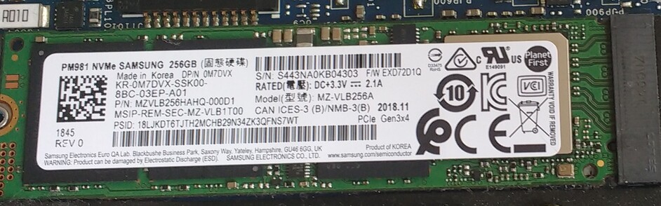 CPU Intel Core i5 8250u Passmark : 6400 RAM 8 GB Drives Samsung PM 981 M.2 NVME solid state disk, 256 GB Ports USB type C (3), Headphone, micro SD OS Windows 10I assume the Windows was version 10, but I never used it. It was gone with the wind, in 10 seconds. Windows is for children. This is the CPU: https://www.cpubenchmark.net/cpu.php?cpu=Intel+Core+i5-8250U+%40+1.60GHz&id=3042