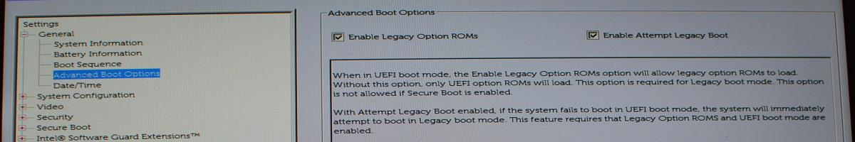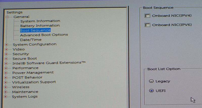 Bootsequence : Boot list option = choose UEFI, not Legacy Advanced Boot options : Enable Legacy Option ROMs = enabled Enable Attempt Legacy Boot = enabled Secure Boot : Disabled UEFI Capsule Firmware Updates : EnabledFrom the moment I had these settings, I could boot any USB disk image. BUT you need to press the F12 key when the DELL splash logo appears after/during the cold start. Then wait until the 'one time boot menu' appears and the USB ISO image will be listed. Boot it.